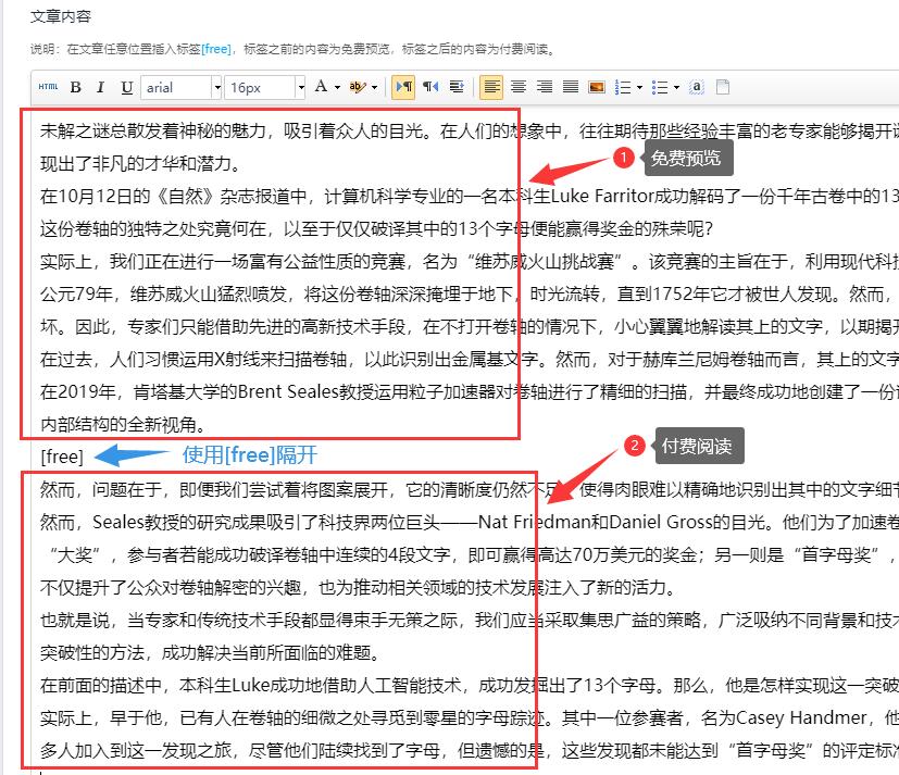 2.在文章内容一栏输入您的完整内容,如果需要部分免费预览,在内容中输入[free]标签即可